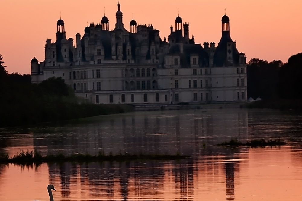 Dit is de achterzijde van Kasteel Chambord in Frankrijk. De zwanen vormen een heerlijk romantisch decor in de prachtige romantische kleuren van deze zonsondergang.