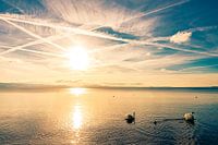 Zwanen in de Bodensee bij zonsondergang en tegenlicht
