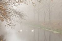 Foto van een paar zwanen met hun jongen, zwemmend in het water. Het is een erg mistige dag.