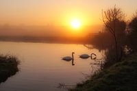 Landschap met zwanen, mist en prachtige kleuren en licht.