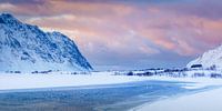 Twee Wilde Zwanen zwemmen in het laatste open water met de naam Skjellstraumen op Lofoten in het licht van een prachtige avondschemering. Het is het gebied dat bekend staat als Torvdalshalsen met het zicht op de bergen van Eggum.