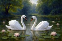 Koop dit landschapskunstwerk Zwanen in een vijver met lelies schilderij. van Johannes op canvas, aluminium dibond, (ingelijste) fotoprint, behang en ArtFrame, op maat geprint in Fine-Art kwaliteit.