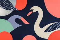 Elegante zwanen zwaaien met hun sierlijke kop boven een diepdonkere achtergrond die harmonieert met levendige geometrische vormen in zachte pastelkleuren. Dit boeiende samenspel van kleur en patroon zorgt voor een frisse en toch rustgevende sfeer, perfect voor de woonkamer, waar het de conversatie verlevendigt en de kamer verandert in een kunstzinnig toevluchtsoord.