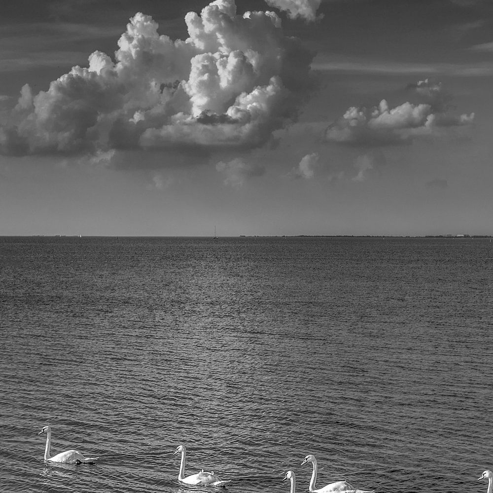 Een klein aantal zwanen in zwartwit op het IJsselmeer op een fraaie zomerdag in volgorde zwemmend richting horizon