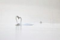 Laat je meevoeren naar een betoverende wereld waar liefde en mystiek samenkomen in de ochtendmist. Twee zwanen drijven elegant over het kalme water, hun veren gehuld in een waas van mysterie terwijl de zachte nevel hen omhult als een warme deken.