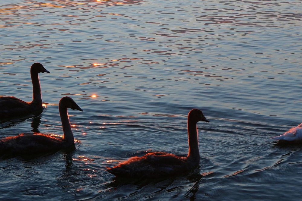 Zwanenfamilie op meer bij zonsondergang, Bodenmeer, Duitsland