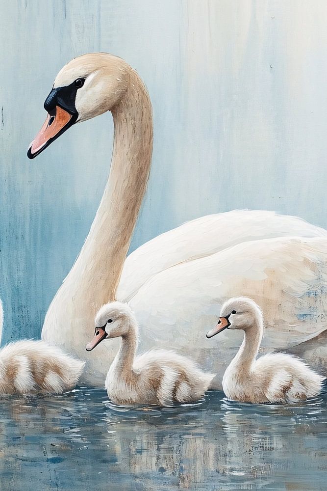 Een prachtig schilderij van een serene zwanenfamilie op een kalm meer. De zachte kleuren en het realistische ontwerp stralen rust en elegantie uit. Ideaal voor het creëren van een ontspannen sfeer in uw woonkamer of eetkamer. Het werk past perfect in zowel klassieke als moderne interieurs, dankzij het tijdloze onderwerp en het subtiele kleurgebruik. Dit stuk brengt een vleugje natuur in huis en is een prachtige blikvanger die uw ruimte verrijkt.