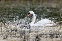 Een volwassen zwaan zwemt met 3 jongen in een vijver in de Oberlausitz.