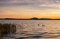 Zwanenmeer bij zonsondergang. Zwanen op het water van Lac de Madine in het Natuurpark Lotharingen, Frankrijk. Het is een prachtig meer, waarlangs je mooie wandelingen en fietstochten kunt maken. Een romantische plek.