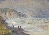 Zijn hele leven lang schilderde Monet een van zijn favoriete motieven, de landschappen van de zee en de lucht van zijn thuisregio Normandië. Van dit onderwerp kan gezegd worden dat het door zijn leraar Boudin aan Monet is nagelaten. Maar terwijl de vele werken die nog steeds van Boudin zijn, focussen op genre-elementen, was Monet geïnteresseerd in het landschap zelf. In tegenstelling tot de technieken die in de meeste van zijn andere landschappen worden gebruikt, gebruikte Monet een ritmische vermenging van ruwe penseelstreken en een zeer lichte laag pigment in dit werk dat hij in een klein vissershutje aan het strand maakte. Het penseelwerk is zeer licht op de lichte schitteringen van het rustige oppervlak van de zee en wordt steeds dikker en onrustwekkender naarmate de kunstenaar een onmiddellijke indruk van piekende golven en bruisende wolken laat zien. Hoewel vrij ver verwijderd van de penseelstreken van het oorspronkelijke Impressionisme, is de vrije penseelstreek in Monet's laatste werken hier een voorbode van de vrije penseelstreek. (Bron: Meesterwerken van het Nationaal Museum voor Westerse Kunst, Tokio, 2009, cat. nr. 75)