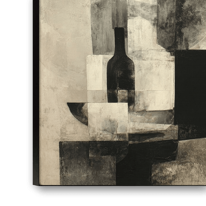 Dit zwart wit abstract schilderij toont een modern geometrisch stilleven met de gestileerde contouren van een fles, kom en zachte gelaagde vlakken die in elkaar overvloeien. Strakke lijnen wisselen af met verweerde texturen en tonen een intrigerend spel van licht en schaduw in grijs, beige en diep zwart. Dit kunstwerk geeft een…