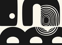 Een abstract schilderij van organische geometrische vormen in zwarte en witte kleuren met een impressie van Scandinavische kunst uit Noord-Europa.