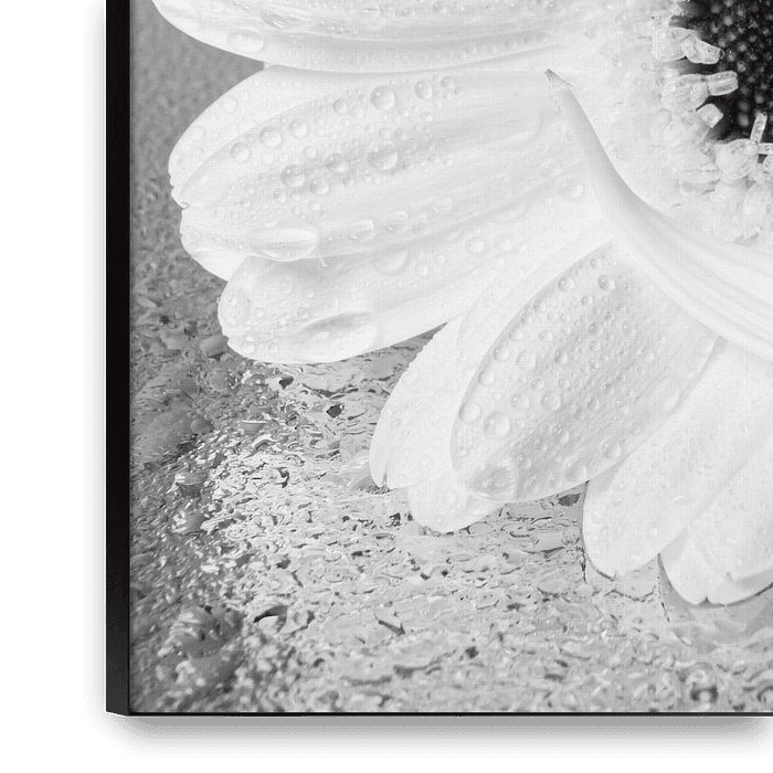 Koop dit moderne kunstwerk Zwart - Wit: Een vierkantje gerbera met een los blaadje van Marjolijn van den Berg op canvas, aluminium dibond, (ingelijste) fotoprint, behang en ArtFrame, op maat geprint in Fine-Art kwaliteit.