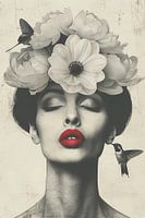 Een beeld dat kracht en mysterie uitstraalt. Deze zwart-wit compositie toont een vrouw met gesloten ogen, omringd door een bloemrijke kroon en twee kolibries. De enige kleur die doorbreekt is haar felrode lippenstift, een sterk contrast dat direct de aandacht trekt.