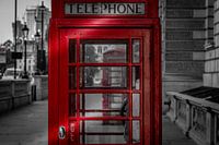 Doorkijkje door een rode telefooncel in Londen.