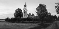 Een 2:1 panorama foto in Zwart-Wit van een vroege ochtend in Westerdijkshorn, een plaats in de gemeente Het Hogeland in de provincie Groningen. Er liggen slechts een aantal huizen en boerderijen waarbij de plaats wordt gekenmerkt door de vroegere begraafplaats met de kenmerkende Kerktoren.
