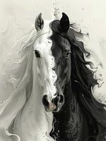 Dit indrukwekkende, trendy kunstwerk is een indrukwekkend portret van een paard, bijzonder uitgevoerd in zwart en wit, waarbij het beeld precies in het midden gesplitst is.
