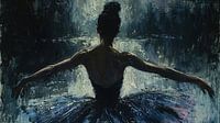 De danseres staat met haar rug naar de kijker, haar armen sierlijk uitgestrekt alsof ze de ruimte om haar heen omarmt. Ze draagt een donkerblauwe tutu die harmonieert met de sombere, koele tonen van de achtergrond. De belichting komt van achteren, waardoor haar silhouet dramatisch afsteekt tegen de gloed van het licht. De dikke, expressieve penseelstreken geven textuur en diepte aan het schilderij, terwijl de donkere kleuren een gevoel van mysterie en melancholie oproepen.