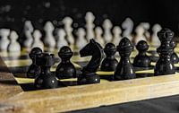 Zwart begint........ Schaakspel staat klaar om te gaan spelen met de zwarte stukken op de voorgrond