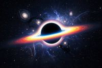 Illustratie van een zwart gat omgeven door een accretieschijf, tegen een achtergrond van sterren en sterrenstelsels in de ruimte.