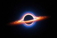 Een zwart gat omringd door een wervelende accretieschijf van oranje en blauw licht, tegen een achtergrond van sterren.
