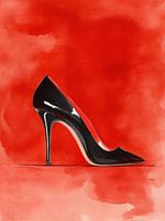 Een minimalistisch sensueel kunstwerk met een zwart lederen hoge hak op een roodgeschilderde aquarelachtergrond roept een krachtig contrast op tussen de stoerheid van het zwarte leer en de warmte van de rode tinten. De hoge hak, strak en elegant, staat centraal in de compositie. Het leer heeft een subtiele glans, die de textuur en de…