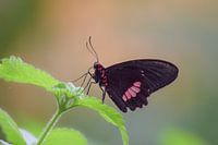 Macro foto van een mooie zwart met rode vlinder op een struik met groene bladeren en een mooie scherptediepte die zorgt voor een onscherpe voorgrond en achtergrond