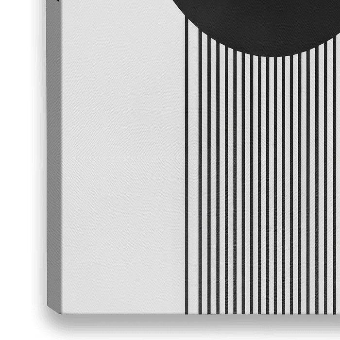 Een krachtig contrast tussen de diepe duisternis van een perfecte cirkel en het vleugje lichtheid van de verticale lijnen. Deze geometrische symbiose nodigt uit om na te denken over het samenspel van vorm en ruimte en straalt tegelijkertijd rust en dynamiek uit. Een minimalistisch meesterwerk dat onze kijk op de essentie uitdaagt.