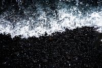 De golven van de Atlantische oceaan spoelen aan op het zwarte kiezelstrand van het Portugese eiland Madeira. De zwarte kiezels glinsteren, terwijl het witte schuim op de golven voor een mooi contrast zorgen.
