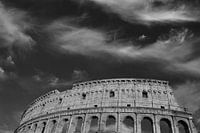 Het Colosseum, maar eens anders gezien. De bovenste ringen van dit wereldberoemde amfitheater in Rome, maar dan in zwart wit, en met een sfeervolle wolkendek erachter