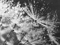 "Zwart- wit: De druppels schitteren op de paardenbloem" is een macrofoto van de pluisjes van een paardenbloem. Op de pluisjes van de paardenbloem zitten kleine druppeltjes water.