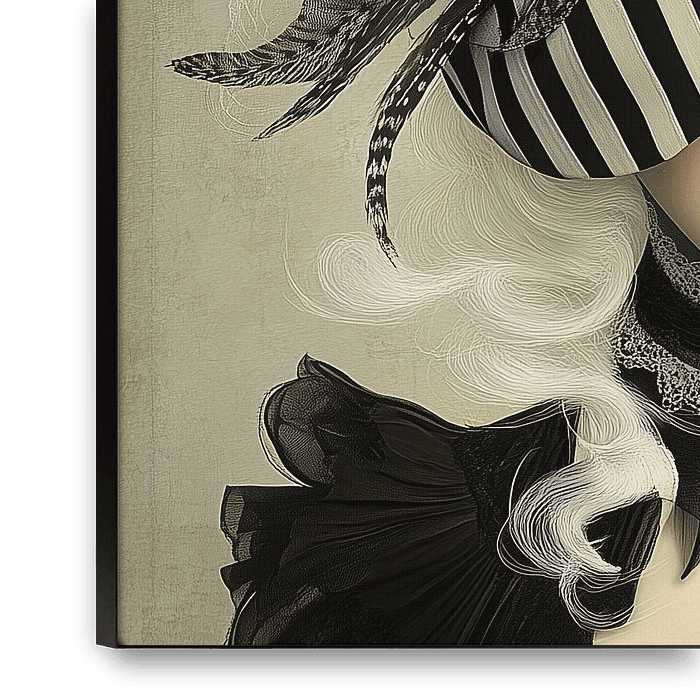 geraffineerd en surrealistisch portret van een vrouw, gekleed in een opvallende hoed met zwart-witte strepen en sierlijke veren. De hoed, een combinatie van klassieke elegantie en extravagantie, domineert het beeld en geeft het een theatrale uitstraling. De vrouw heeft golvend wit haar, wat een sterk contrast vormt met de donkere…