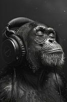 Een diepgaande zwart-witte apenlook, met moderne koptelefoons, verbeeld in een emotioneel CGI-artwork.