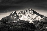 Zwart-wit beeld van de berg Watzmann met dramatische wolken in de ochtend. Berchtesgaden, Beieren