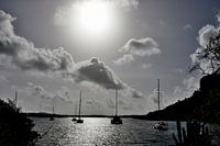 Deze (bijna) zwart-wit compositie van zeilboten, water en zon betreft een foto die op 13 juli 2025 is gemaakt in de buurt van de Caracasbaai in Curaçao. Van deze foto is ook een bredere versie beschibaar (16:9), waarin de zon als zodanig niet zichtbaar is.