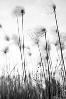 Harde wind waait door katoen gras, of wolsprietjes. De zaadjes worden zo verspreid. Dagelijks leven in de duinen van Zweden. Fluffy wolsprieten - veenpluis.