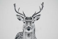 Dit zwart-wit fotografische kunstwerk toont de majestueuze gratie van een hert in adembenemende helderheid. De minimalistische compositie benadrukt de fijne details van het gewei en de expressieve ogen, wat een krachtige maar serene uitstraling creëert. Perfect voor natuurliefhebbers die hun woon- of kantoorruimte willen verfraaien met een elegante en tijdloze decoratie. Deze foto vangt de essentie van het wild en de schoonheid van de natuur en inspireert tot een diepe band met wilde dieren.
