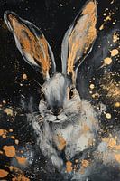 Dit unieke kunstwerk combineert de kracht van expressionisme met moderne technieken en dynamiek. In het schilderij staat een konijn centraal, dat in gedurfde, grijs-zwarte tinten is geschilderd tegen een diepzwarte achtergrond. Wat dit ontwerp echter echt bijzonder maakt, zijn de levendige gouden spatten die over het hele beeld heen zijn verspreid. Ze creëren een spannend contrast met de donkere achtergrond en brengen het konijn tot leven. Dit stuk is perfect voor wie een moderne en dynamische sfeer aan zijn interieur wil toevoegen, met een vleugje verfijnde kunst. Of het nu in de woonkamer, een kantoorruimte of een moderne loft wordt opgehangen, het brengt gegarandeerd karakter en stijl in elke ruimte.