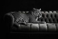 In glinsterend zwart en wit zit een majestueuze luipaard elegant op een klassieke Chesterfield bank. De contrastrijke afbeelding benadrukt de fascinerende patronen van zijn vacht en voegt een vleugje exotisme toe aan de kamer. Dit kunstwerk past perfect in een stijlvolle woonkamer en trekt gegarandeerd de aandacht van elke bezoeker.