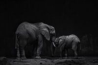 Dit indrukwekkende zwart-wit ontwerp toont een volwassen olifant en een baby olifant in een intiem moment. De gedetailleerde weergave van hun rimpels en texturen wordt versterkt door het gebruik van schaduwen en lichtcontrasten, wat een dramatisch en ontroerend effect geeft. Perfect voor een minimalistische of moderne inrichting, dit stuk straalt kracht en zachtheid uit. Het is een prachtig kunstwerk dat de majestueuze schoonheid van olifanten en hun diepgaande banden benadrukt. Ideaal voor in de slaapkamer of kantoor, dit ontwerp voegt een serene en tegelijkertijd krachtige esthetiek toe aan elke ruimte.
