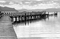 Over ‘Zwart-wit opname van vervallen steiger aan de zuidoever van Lake Taupo, Nieuw-Zeeland’ van Rini Kools
