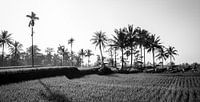 Panorama foto van een rijstveld op Bali. Zwart wit en landschapsfotografie. Palmbomen zorgen voor een sterk contrast. Reisfotografie.
