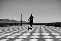 Perfecte zwart wit foto met meerdere lijnen. Deze foto is genomen in Livorno in Italië op een plein met een erg fotogeniek zwart wit patroon wat veel weg heeft van een heel erg groot schaakbord. Ook de balustrades geven meer lijnen aan het geheel. Maar natuurlijk is het onderwerp de jongen die op zijn elektrische step voorbij komt. Hij…