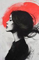 Een fascinerend portret dat boeit met zijn sterke silhouet en dynamische kapsel. De felrode achtergrond geeft de compositie een spannende energie en voegt een krachtig accent toe. Perfect voor de woonkamer, waar het interessante gesprekken kan stimuleren en een vleugje artistieke flair kan toevoegen.