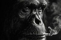 Een intens zwart-wit portret van een peinzende aap met een sigaar, artistiek en expressief.