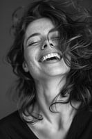 Dit levendige portret van een vrouw toont haar in een moment van pure vreugde terwijl haar haar wild door de lucht dwarrelt. Haar hartelijke lach en dynamische beweging geven het beeld een krachtige energie en joie de vivre. Ideaal voor liefhebbers van expressieve en emotionele fotografie die de schoonheid van het moment in hun kunstwerk waarderen.