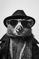 Een wombat in een stijlvolle outfit en accessoires poseert voor een zwart-wit portret. Perfect voor creatieve en humoristische projecten.