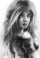 Zwart wit portret van een vrouw die over haar schouder kijkt. Digitaal kunstwerk van een vrouwelijk model. Geschilderd in olieverf stijl.