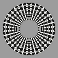 Een abstract digitaal kunstwerk of een ronde bloemachtige vorm met zwart en wit. De achtergrond is midden grijs. Het beeld vibreert. Optische kunst.