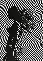 Dit kunstwerk is een silhouet portret dat zich onderscheidt door het gebruik van zwart-witte patronen die een intrigerende optische illusie creëren.